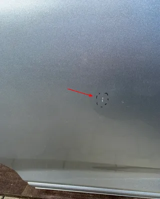 > Kratzer & Schürfschäden (gestrichelt eingekreist - - -)